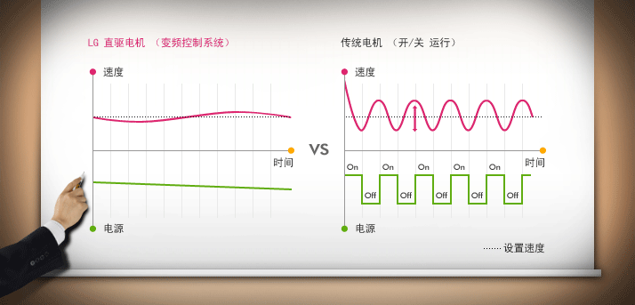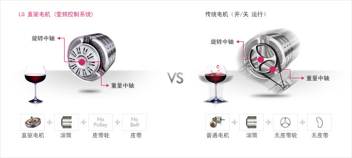 LG變頻直驅(qū)電機(jī)的好處 統(tǒng)一旋轉(zhuǎn)和重量中心:電機(jī)直接作用于滾桶中心 - 增加穩(wěn)定性,震動(dòng)最小化 - 減少噪音-無皮帶摩擦噪音 減少機(jī)器零件數(shù)量-皮帶和皮帶輪被去除 - 增加耐用性-不磨損