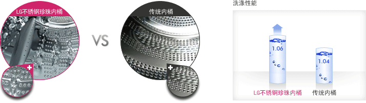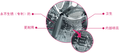 永不生銹(專利)的不銹鋼洗衣滾筒 采用專利的不銹鋼材質(zhì)的滾筒,能保證衣物不受銹漬污染。傳統(tǒng)的油漆涂層桶長時(shí)間使用后漆層容易脫落,與此不同,LG的耐磨不銹鋼內(nèi)桶非常經(jīng)久耐用。